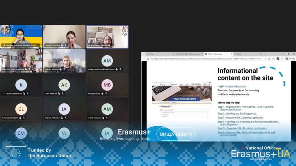 On March 5, 2026, the National Erasmus+ Office in Ukraine team joined a mentoring session for Erasmus+ National Agencies (NAs) and National ERasmus+ Offices (NEOs) regarding the Salto Youth TCA Platform, organized by the Erasmus+ National Agency in Hungary.