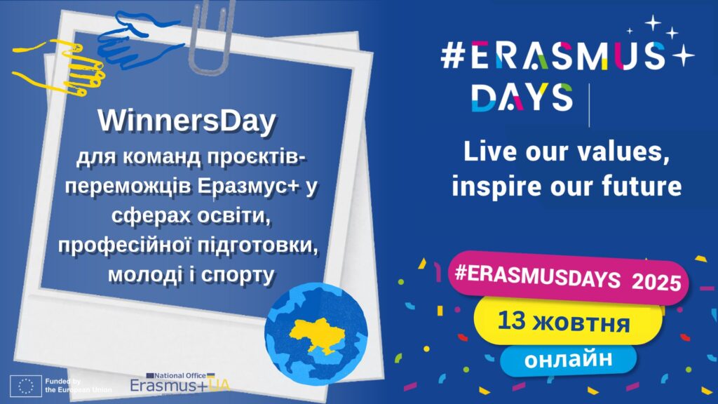 #ErasmusWinnersDay для команд проєктів-переможців Еразмус+ у сферах освіти, професійної підготовки, молоді і спорту: особливості впровадження в умовах воєнного стану в Україні (13.10.2025 р., онлайн)