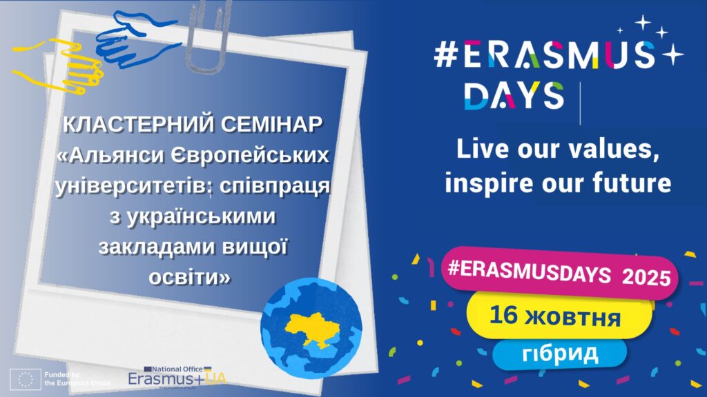 16 жовтня 2025 р., 10:00 – 13:00, в межах Всеукраїнських #ErasmusDays2025 команда Національного Еразмус+ офісу в Україні запрошує взяти участь у кластерному семінарі «Альянси Європейських університетів: співпраця з українськими закладами вищої освіти», який відбудеться у гібридному форматі.