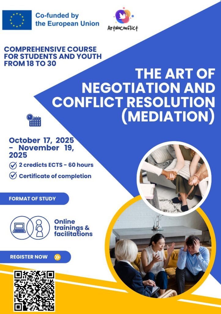 З 17 жовтня по 19 листопада 2025 року відбудеться безкоштовний міжнародний онлайн-курс «The Art of Negotiation and Conflict Resolution (Mediation)» у межах реалізації ініціативи Erasmus+ Virtual Exchange.