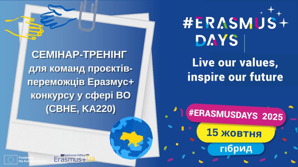 15 жовтня 2025 р., 12:00 – 17:00, в межах Всеукраїнських #ErasmusDays2025 команда Національного Еразмус+ офісу в Україні запрошує команди проєктів-переможців конкурсу у сфері вищої освіти (CBHE, KA220) взяти участь у семінарі-тренінгу щодо особливостей впровадження проєктів в умовах воєнного стану в Україні», який відбудеться у гібридному форматі.